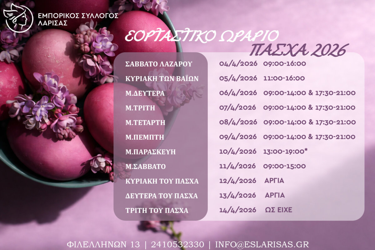 Επίσης ο Εμπορικός Σύλλογος Λάρισας, ανακοινώνει το προτεινόμενο ωράριο λειτουργίας των εμπορικών καταστημάτων της πόλης μας, που θα ισχύσει για την εορταστική περίοδο του Πάσχα 2026.