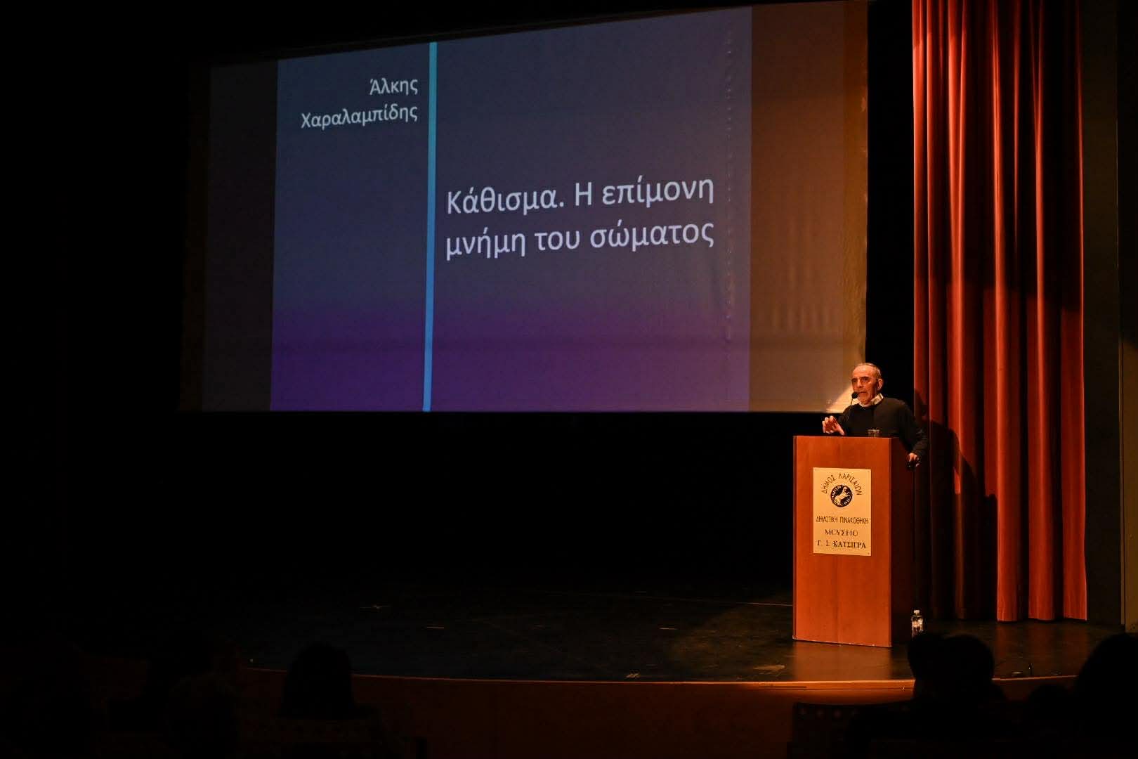 Κεντρικός ομιλητής της εκδήλωσης ήταν ο Άλκης Χαραλαμπίδης, ομότιμος καθηγητής Ιστορίας της Τέχνης του Αριστοτελείου Πανεπιστημίου Θεσσαλονίκης, με θέμα ομιλίας «Κάθισμα. Η επίμονη μνήμη του σώματος».