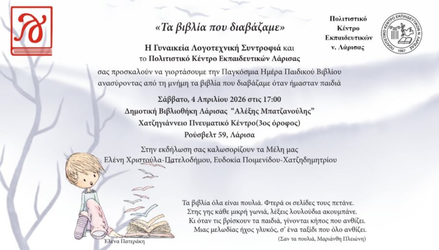 Η Γυναικεία Λογοτεχνική Συντροφιά – ΓΛΣ και το Πολιτιστικό Κέντρο Εκπαιδευτικών νομού Λάρισας – ΠΟΚΕΛ, γιορτάζουν την Παγκόσμια Ημέρα Παιδικού Βιβλίου, ανασύροντας από τη μνήμη τα βιβλία που διαβάζαμε όταν ήμασταν παιδιά, στη Δημοτική Βιβλιοθήκη Λάρισας «Αλέξης Μπατζανούλης», στο Χατζηγιάννειο (3ος όροφος) , το Σάββατο, 4 Απριλίου 2026, στις 5:00 μ.μ. με ελεύθερη είσοδο.