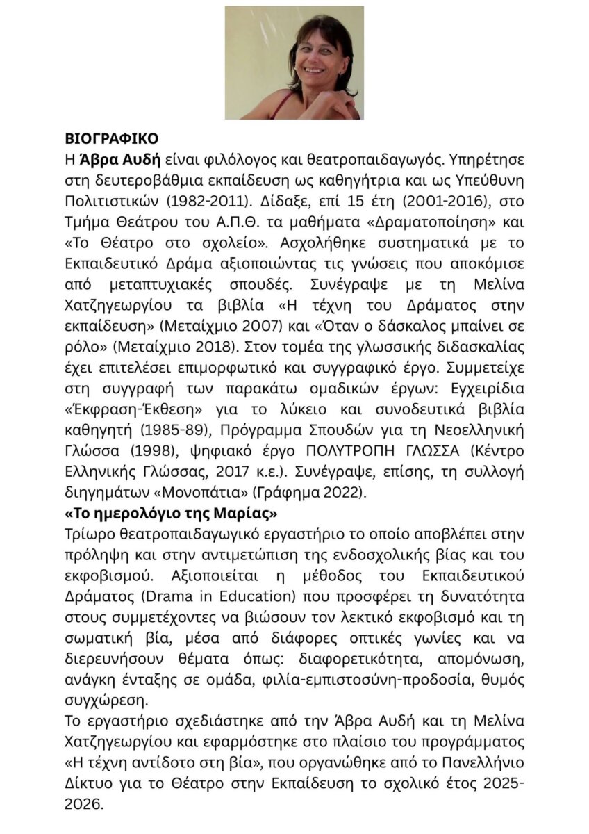 Το εργαστήριο σχεδιάστηκε από την Άβρα Αυδή και τη Μελίνα Χατζηγεωργίου και εφαρμόστηκε στο πλαίσιο του προγράμματος «Η τέχνη αντίδοτο στη Βία» που οργανώθηκε από το Πανελλήνιο Δίκτυο για το Θέατρο στην Εκπαίδευση το σχολικό έτος 2025-2026. Αξιοποιείται η μέθοδος του εκπαιδευτικού δράματος (Drama in Education) και προσφέρεται η δυνατότητα στους συμμετέχοντες να βιώσουν τον λεκτικό εκφοβισμό και τη σωματική βία μέσα από διάφορες οπτικές γωνίες.