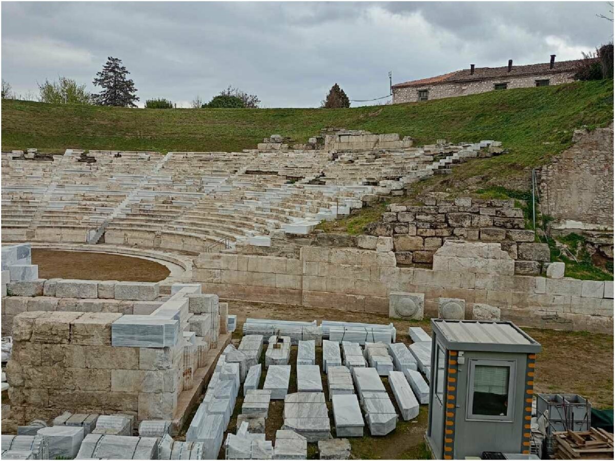 Στη συνέχεια, η ομάδα βρέθηκε στο εμβληματικό Α’ Αρχαίο Θέατρο της Λάρισας. Εκεί, η κ. Ζωή Μουχτή-Φιλόλογος παρουσίασε στα