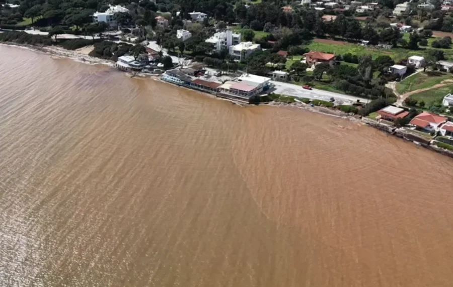 Τα νερά του Ευβοϊκού έγιναν καφέ από την κακοκαιρία Erminio, με αποτέλεσμα η εικόνα να θυμίζει λασπώδη λίμνη.
