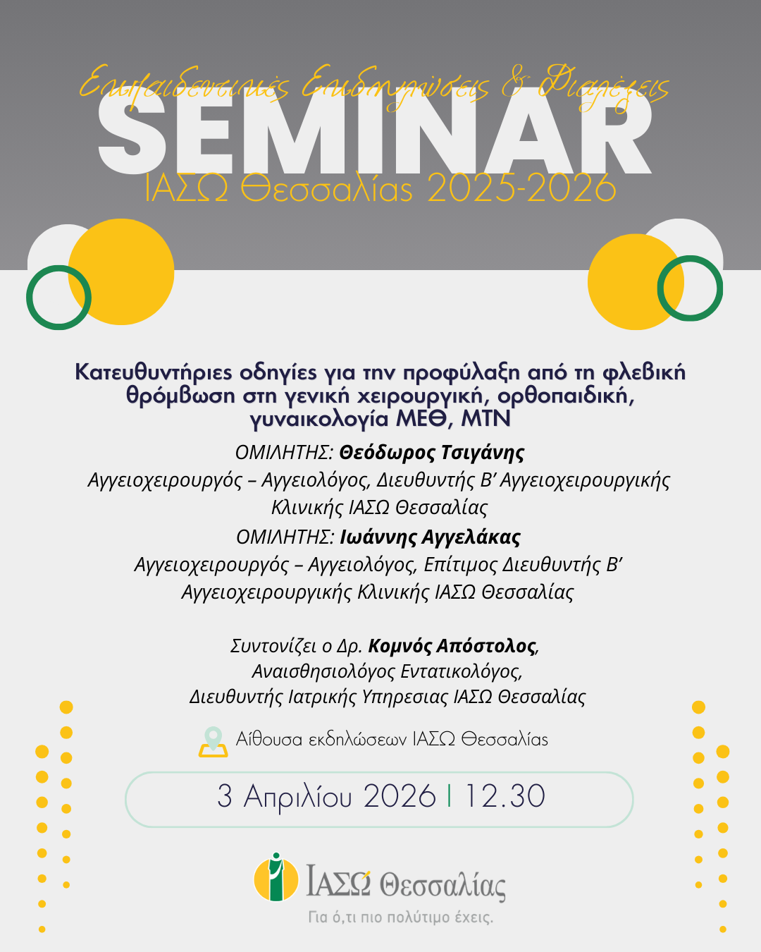 Επιστημονική διάλεξη αύριο στο ΙΑΣΩ Θεσσαλίας με θέμα «Κατευθυντήριες οδηγίες για την προφύλαξη από τη φλεβική θρόμβωση»: