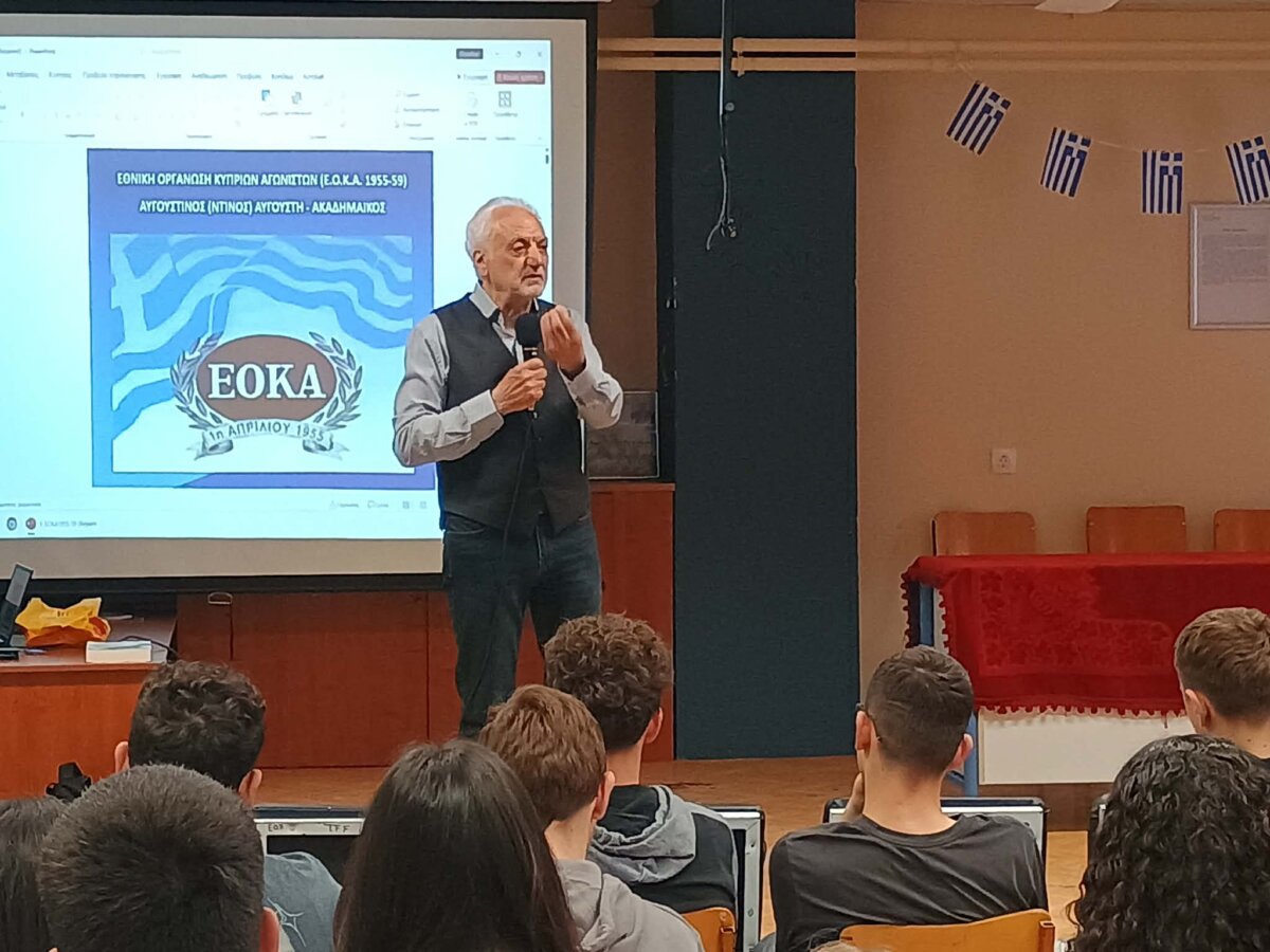 Με ομιλία του προέδρου του Συλλόγου Κυπρίων νομού Λάρισας κ. Ντίνου Αυγουστή συμμετείχε την περασμένη Τετάρτη, 1η Απριλίου, στην 71η επέτειο από την έναρξη του Εθνικοαπελευθερωτικού Αγώνα των Κυπρίων Αγωνιστών (1955-1959) το Πρότυπο Γενικό Λύκειο Λάρισας.