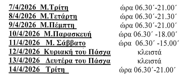 Το Κ.Τ.Ε.Λ Λάρισας ενημερώνει ότι το ωράριο της αποθήκης ασυνόδευτων δεμάτων για τις ημέρες του Πάσχα θα είναι: