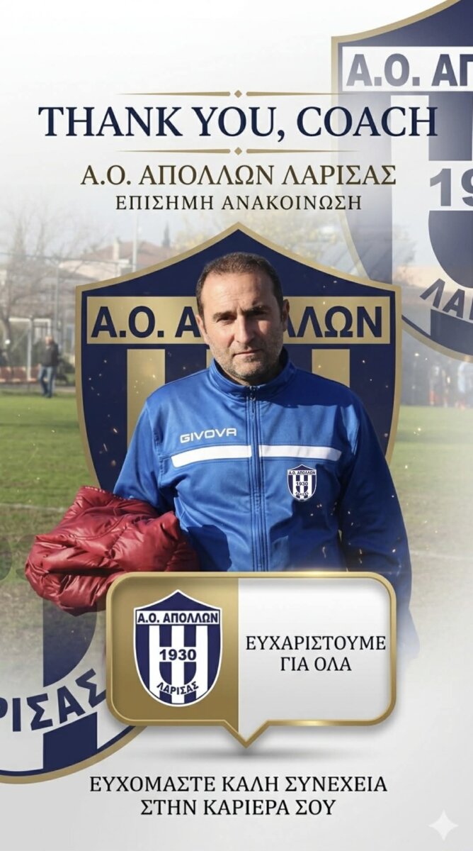 Ο Απόλλων Λάρισας, γνωστοποιεί την λύση της συνεργασίας με τον προπονητή Θοδωρή Στεργιάδη.