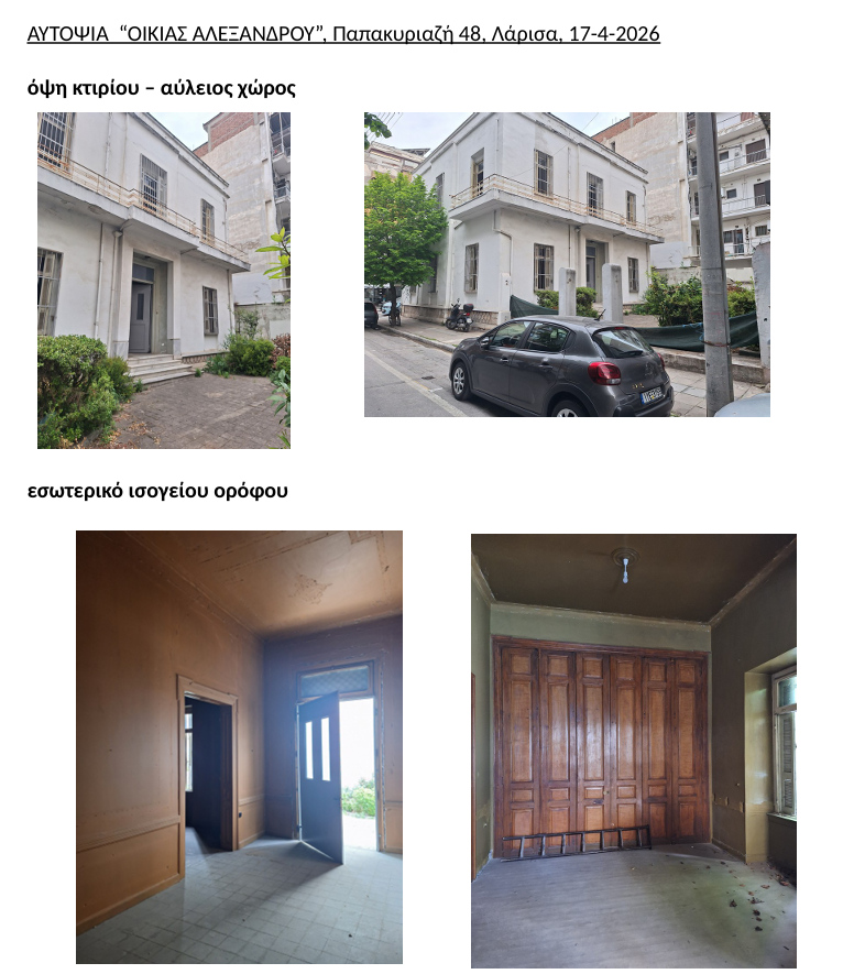 «Με αφορμή δημοσιεύματα που κυκλοφορούν σχετικά με οικοδομικές εργασίες “αποψίλωσης” στο κτίριο “Οικία Αλεξάνδρου”, στην συμβολή των οδών Παπακυριαζή 48 και Π. Μελά στη Λάρισα, η Υπηρεσία μας διενήργησε αυτοψία, την Παρασκευή 17-4-2026 και ώρα 9:30 πμ, κατά την οποία διαπιστώθηκε ότι τόσο στον εξωτερικό αύλειο χώρο όσο και στο εσωτερικό της οικίας (ισόγειο και 1ο όροφο) δεν εκτελούνταν οικοδομικές εργασίες ούτε υπήρχαν ενδείξεις πρόσφατης οικοδομικής δραστηριότητας.