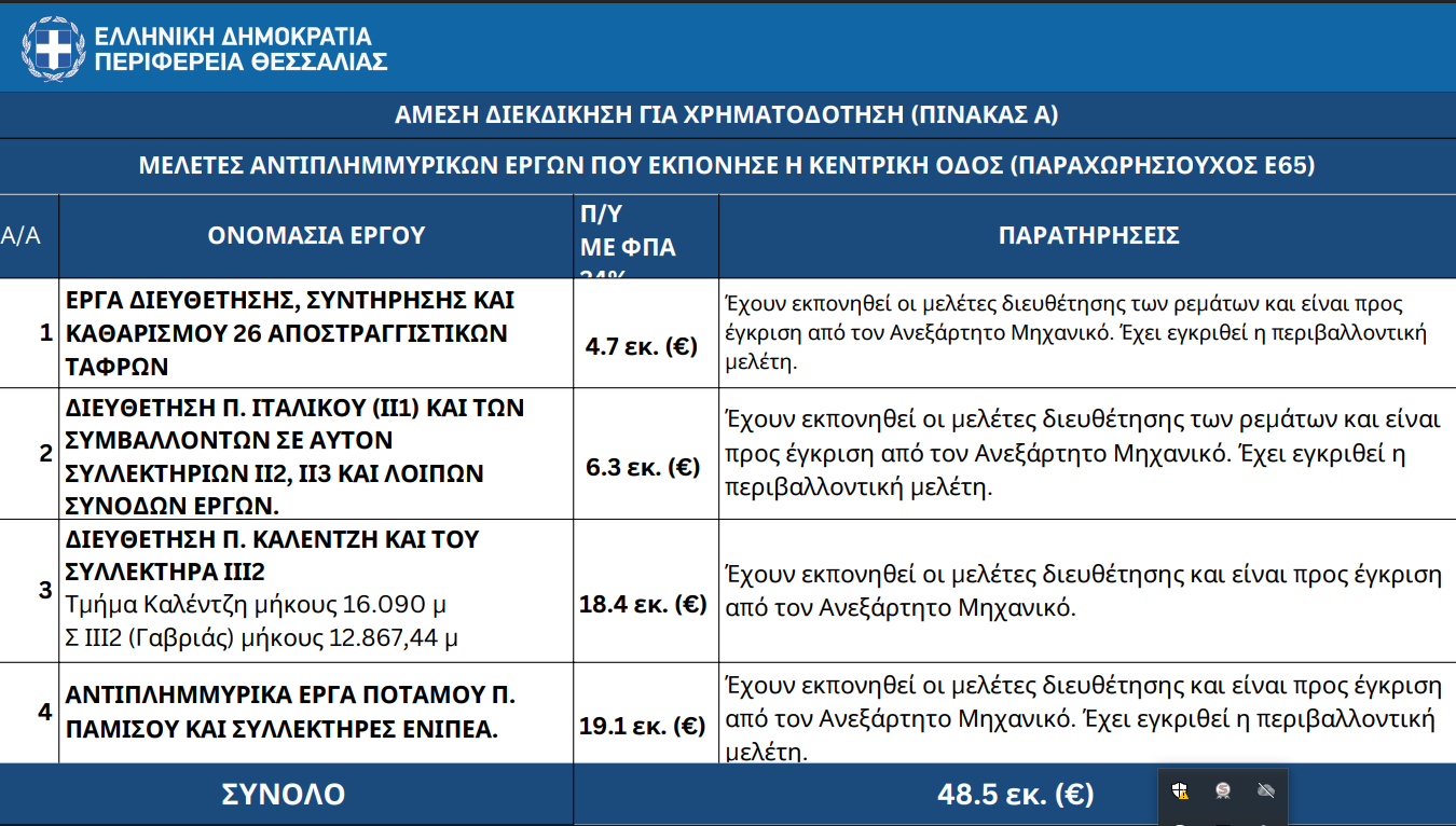 2.Την άμεση υλοποίηση των αντιπλημμυρικών έργων από την εταιρία «Κεντρική Οδός» (Παραχωρησιούχος Ε65)», σύμφωνα με τις μελέτες που εκπόνησε η ίδια, μετά την με αριθμ. πρωτ.ΕΥΔΕ/ΚΣΕΣΠ/Γ/Φ1/6694/16-09-2020 απόφαση Υπουργού Μεταφορών (Έργα του Πίνακα Α)