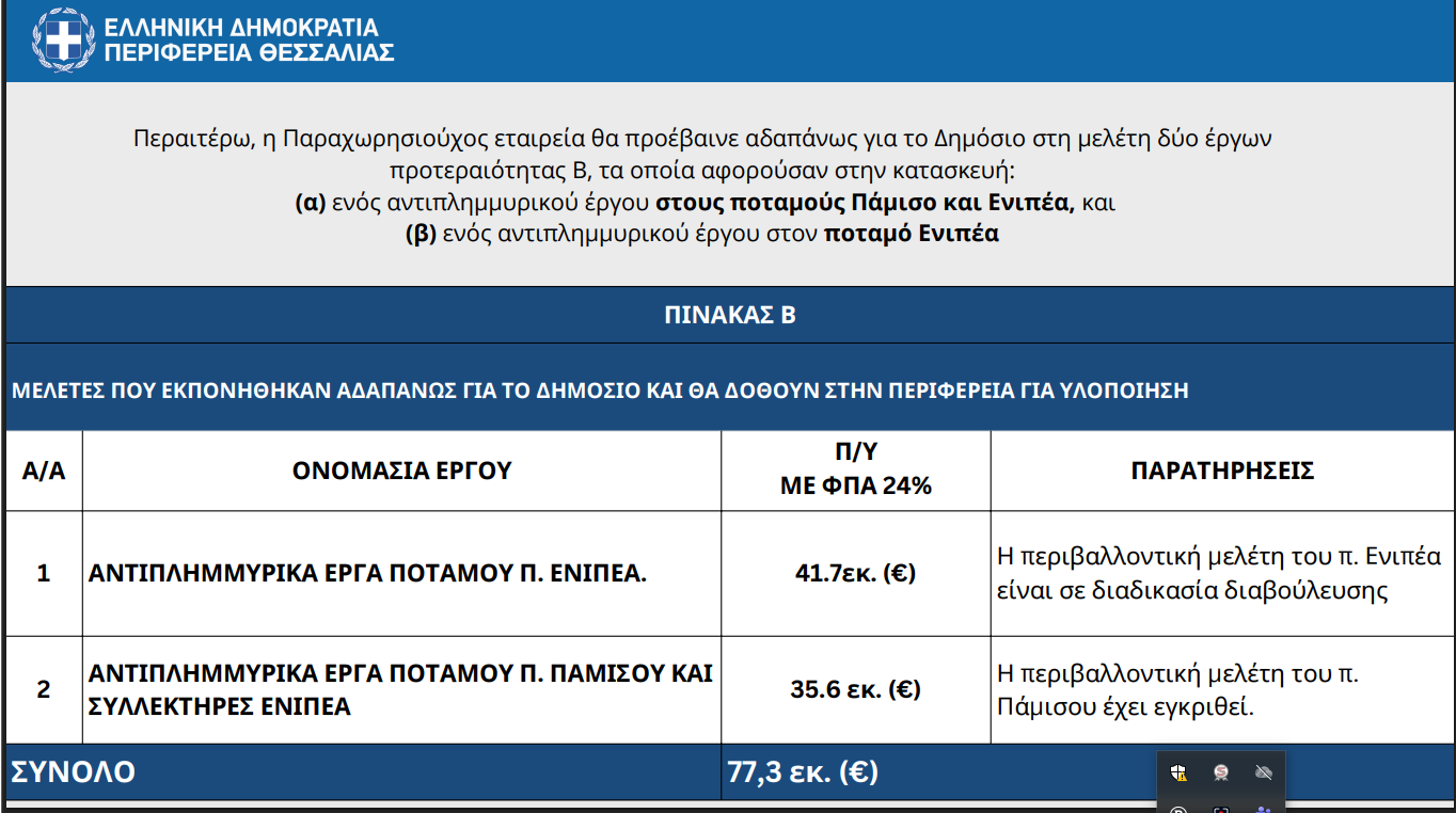 Ο Δημ. Κουρέτας υπογράμμισε ότι από τις προαναφερόμενες εργολαβίες των αντιπλημμυρικών έργων που ολοκληρώνονται σύντομα, δύο (2) συνολικού προϋπολογισμού 12 εκ. ευρώ που αφορούν τους ποταμούς Ενιπέα (6 εκ.ευρώ) και Φαρσαλίτη (6 εκ. ευρώ), ενώ έργα ύψους 13,5 εκ. ευρώ που αφορούν τμήματα των ποταμών Πάμισου, Ενιπέα και Φαρσαλίτη βρίσκονται στη διαδικασία ολοκλήρωσης της ανάθεσης και υπογραφής των συμβάσεων.