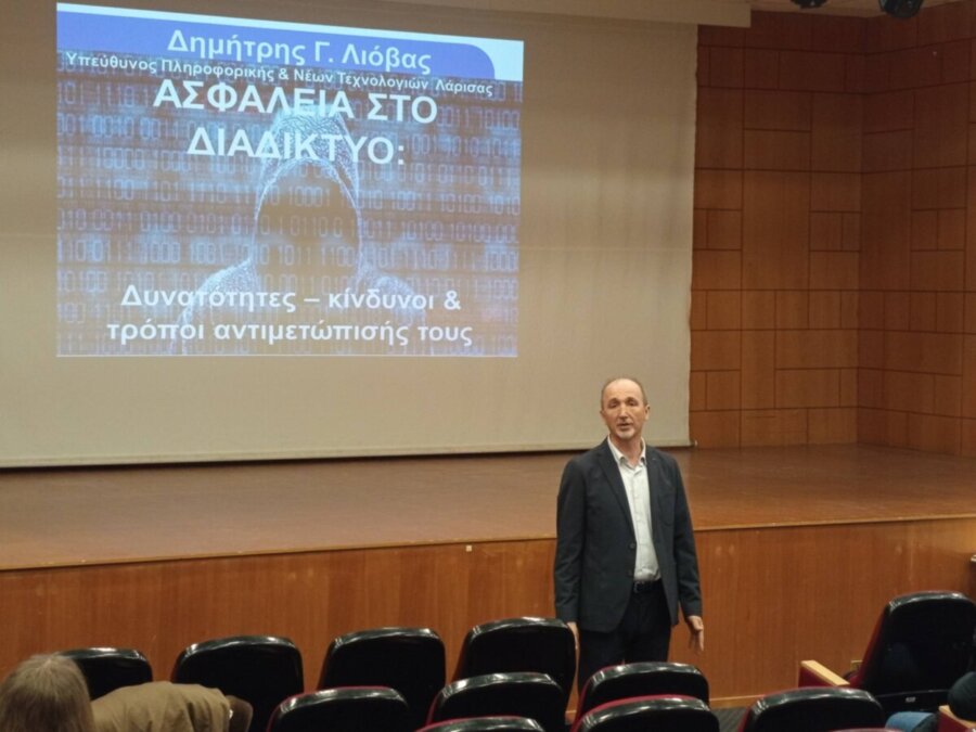 Εισηγητής της ενημερωτικής εκδήλωσης ήταν ο Καθηγητής Πληροφορικής και Υπεύθυνος Πληροφορικής και Νέων Τεχνολογιών Β/θμιας Εκπαίδευσης Λάρισας κ. Δημήτριος Γ. Λιόβας, ο οποίος αφού τόνισε τη χρησιμότητα και την αξία του Διαδικτύου στη σημερινή εποχή, επεσήμανε τους αυξημένους κινδύνους που εμπεριέχει η αλόγιστη και απρόσεκτη χρήση του και παρουσίασε τρόπους προστασίας από τους κινδύνους, με τη βοήθεια πολυμεσικών εφαρμογών, αλλά και χρήσιμων συμβουλών προς τους μαθητές/μαθήτριες και τους εκπαιδευτικούς του Σχολείου!