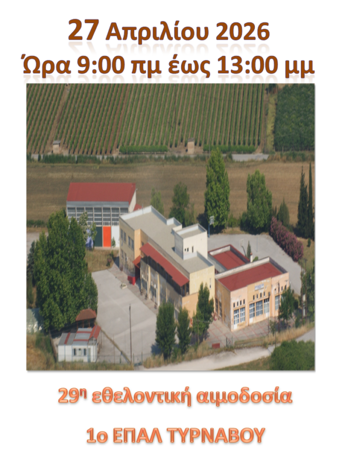 Τη Δευτέρα, 27 Απριλίου 2026 θα πραγματοποιηθεί στο 1ο ΕΠΑΛ Τυρνάβου, σε συνεργασία με το τμήμα αιμοδοσίας του Γενικού Νοσοκομείου Λάρισας, η 29η εθελοντική αιμοδοσία.