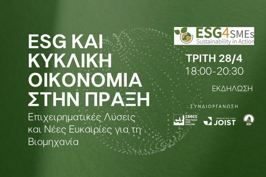 Ο Σύνδεσμος Βιομηχανιών Θεσσαλίας & Στερεάς Ελλάδος – ΣΒΘΣΕ, σε συνεργασία με το JOIST Innovation Park και το Ινστιτούτο Ανάπτυξης και Επιχειρηματικότητας (iED), διοργανώνει την Τρίτη 28 Απριλίου 2026 εκδήλωση με θέμα: «ESG & Κυκλική Οικονομία στην Πράξη: Επιχειρηματικές Λύσεις και Νέες Ευκαιρίες για τη Βιομηχανία».