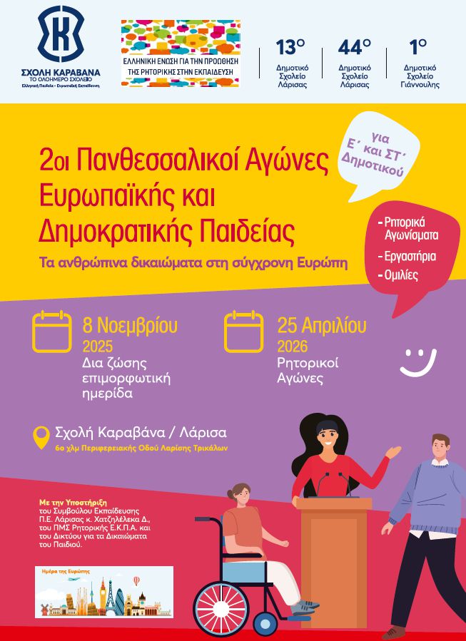 Το Σάββατο 25 Απριλίου θα πραγματοποιηθούν στις εγκαταστάσεις της Σχολής Καραβάνα οι 2οι Πανθεσσαλικοί Αγώνες Ευρωπαϊκής και Δημοκρατικής Παιδείας, μια σημαντική εκπαιδευτική διοργάνωση με επίκεντρο τις αξίες της δημοκρατίας, του διαλόγου και της ενεργού πολιτειότητας.