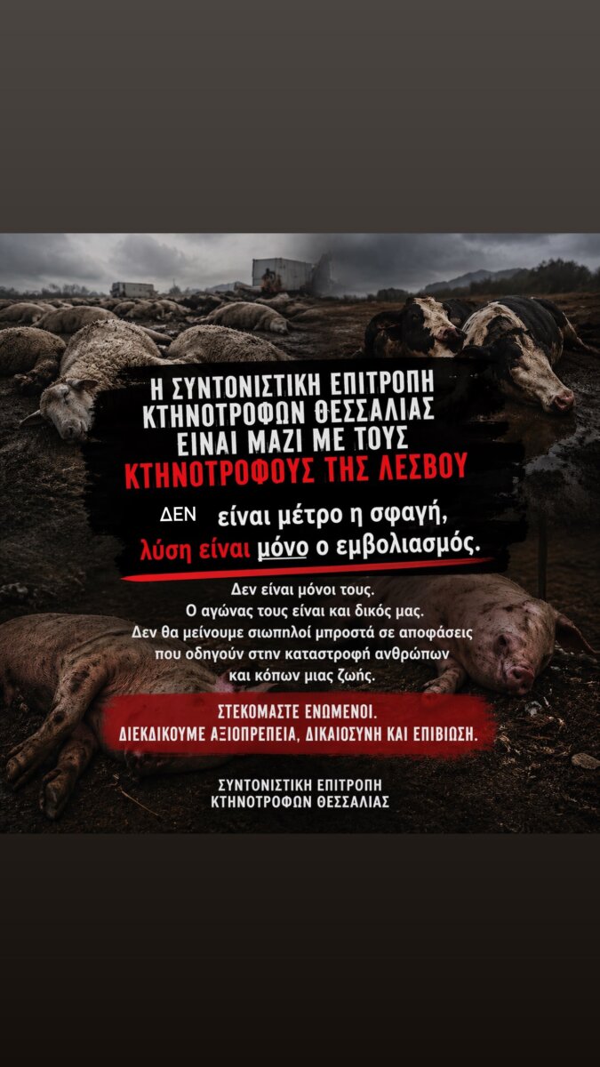 Η Συντονιστική Επιτροπή Κτηνοτρόφων Θεσσαλίας εκφράζει τη στήριξή της στους κτηνοτρόφους της Λέσβου.