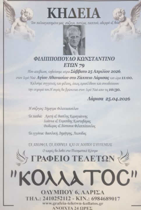 Η κηδεία του θα γίνει αύριο Σάββατο στον Ιερό Ναό Αγίου Αθανασίου στο Ζάππειο Λάρισας, στις 11 πμ.