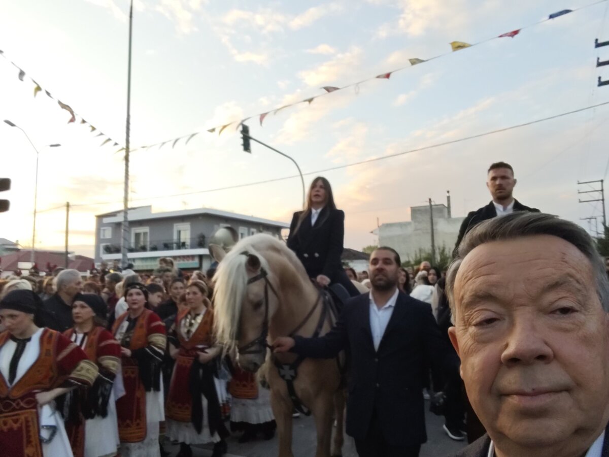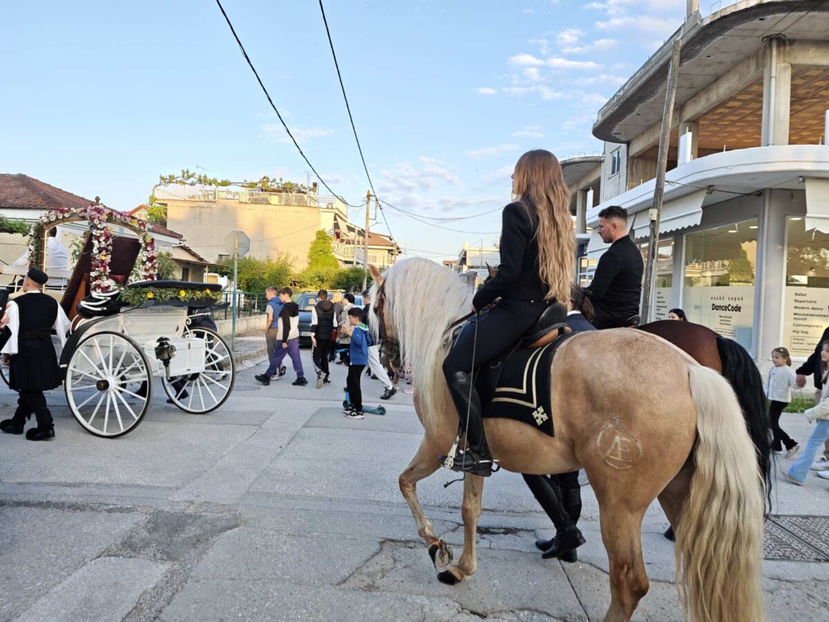 Κατά την διάρκεια της Πομπής που ξεκίνησε από το σημείο της πνευματικής αναφοράς, την Εκκλησία του χωριού, μετά την τέλεση του Εσπερινού, μία παραδοσιακή λευκή άμαξα συρόμενη από ένα πανέμορφο άλογο, που συνοδεύονταν από ένα ζευγάρι έφιππων, παρέλαβε την Ι. Εικόνα και την περιέφεραν στο χωριό, ακολουθούμενοι από τις Αρχές του τόπου και μέγα πλήθος ευσεβών πιστών.