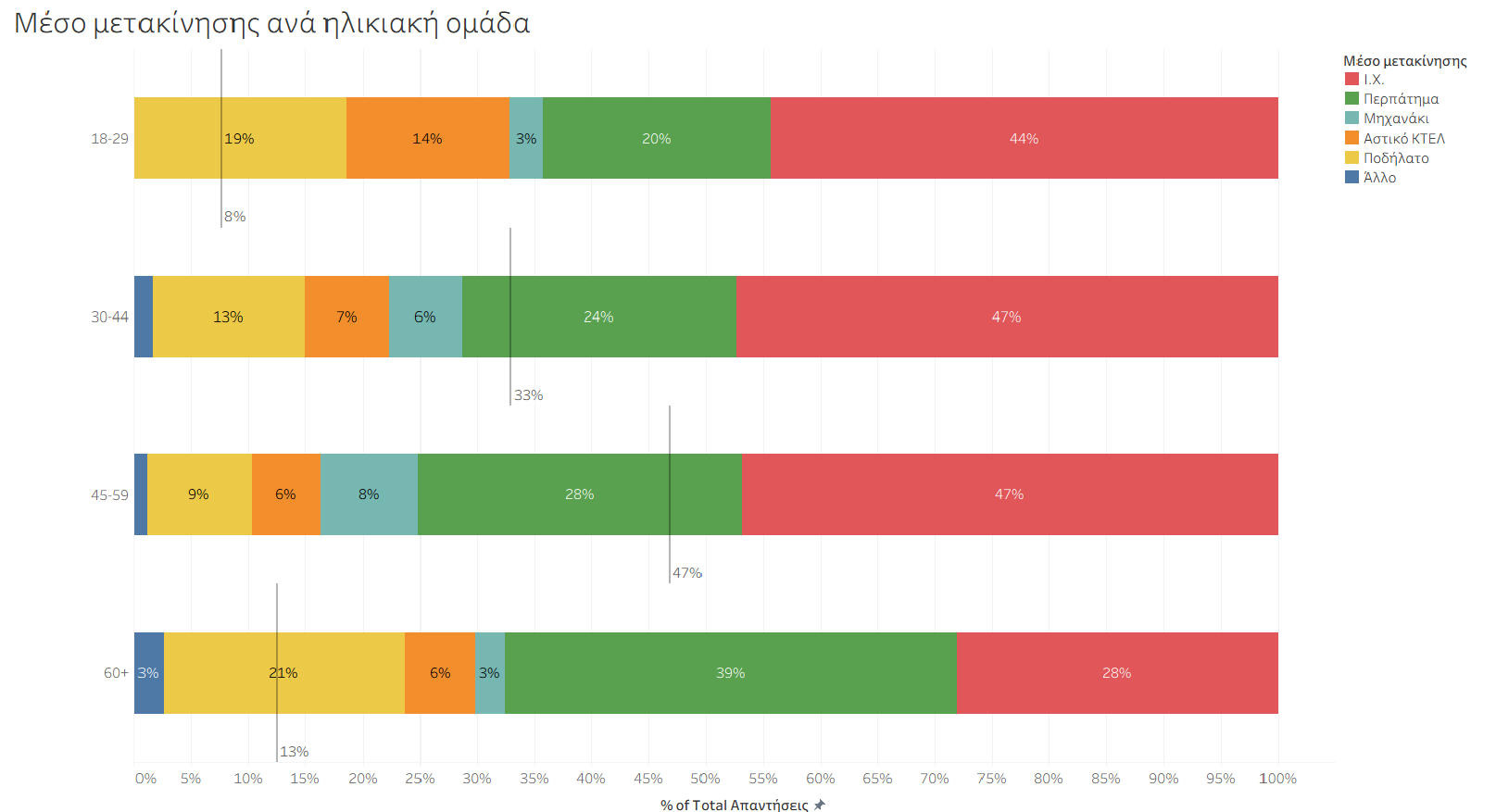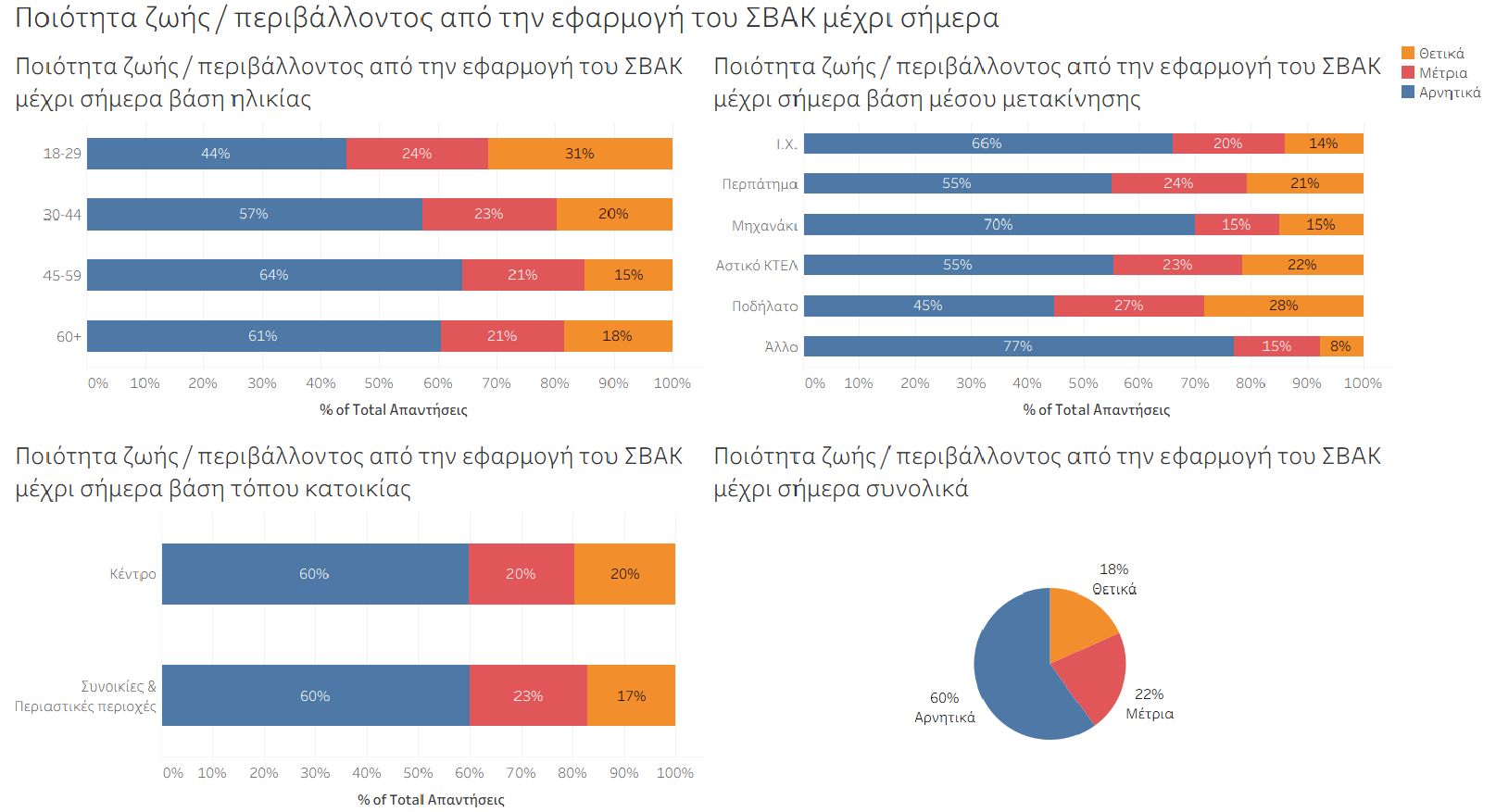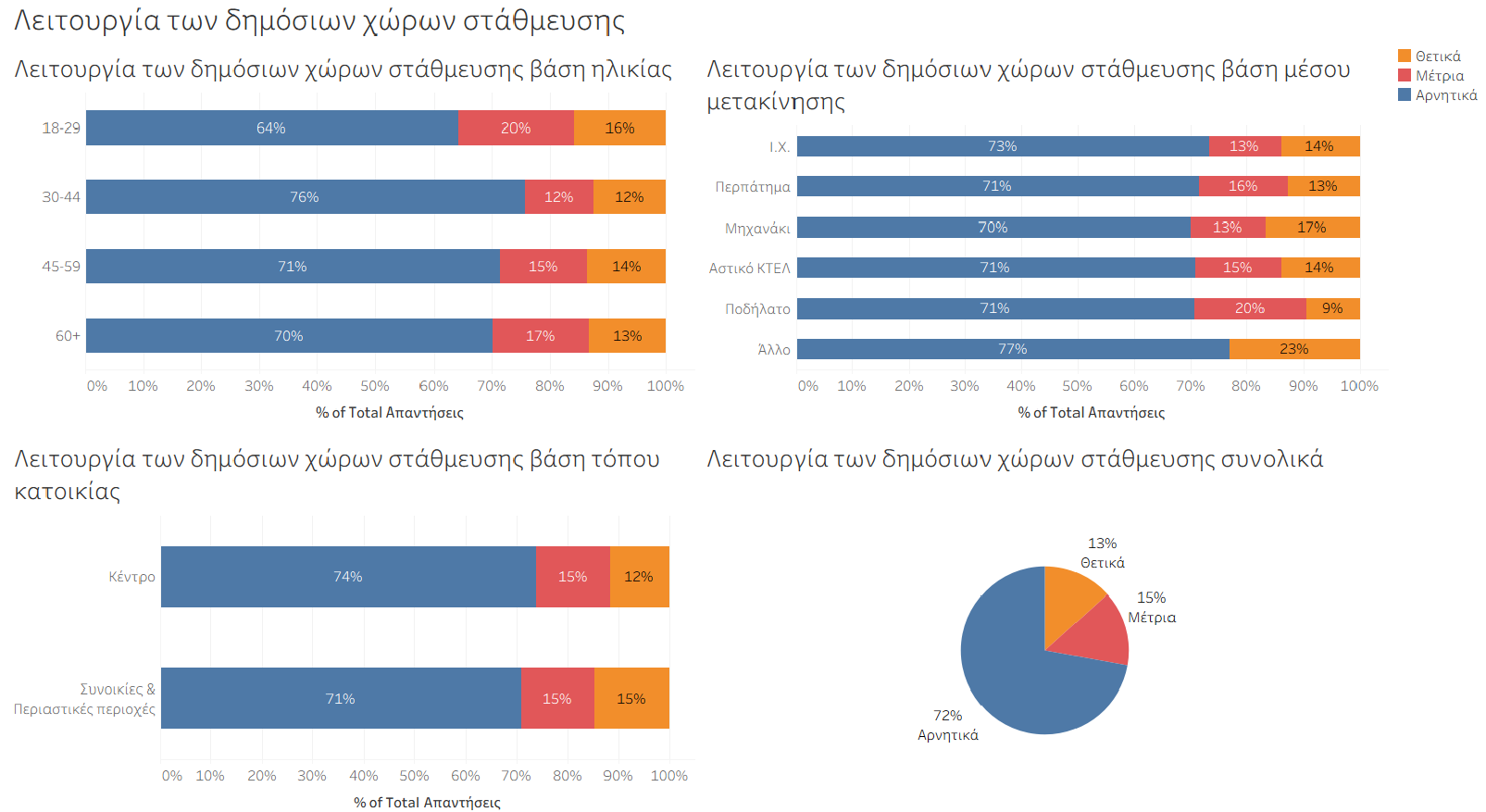 Όσον αφορά τον τρόπο μετακίνησης, η πιο αρνητική εικόνα εμφανίζεται σε όσους χρησιμοποιούν «άλλο» μέσο μετακίνησης (77%), ενώ ακολουθούν όσοι κινούνται με μηχανάκι (70%) και ποδήλατο (68%). Οι χρήστες Ι.Χ., πεζοί και επιβάτες αστικού ΚΤΕΛ επίσης εκφράζουν κυρίως αρνητικές απόψεις, κάτι που δείχνει ότι η προσβασιμότητα παραμένει γενικό πρόβλημα σε όλους τους τρόπους μετακίνησης.