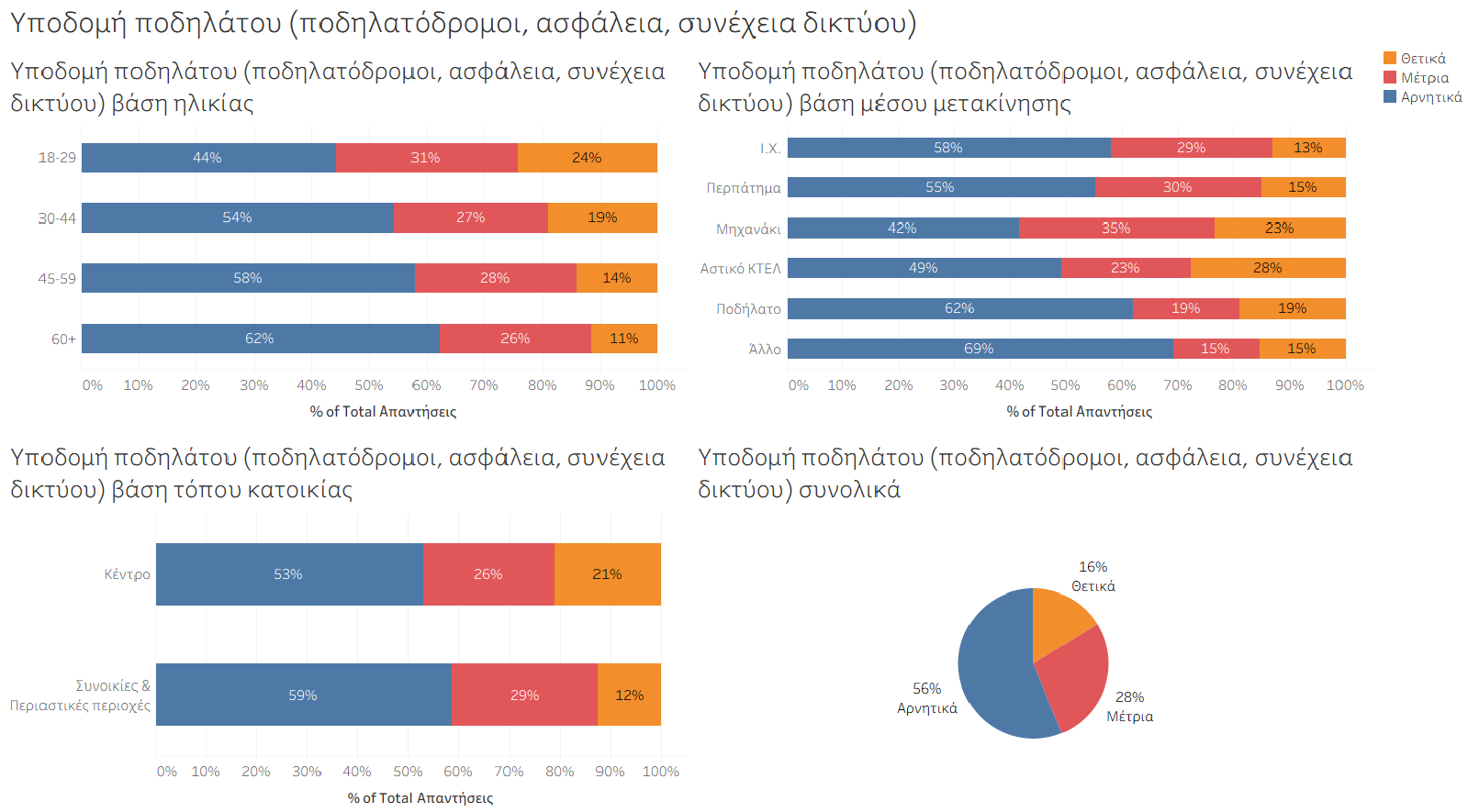 Παράλληλα, μέτρια αξιολογούνται οι υποδομές για πεζούς, ενώ ακόμη χαμηλότερη είναι η ικανοποίηση από τις υποδομές για ποδήλατο, γεγονός που δείχνει ότι οι υπάρχουσες συνθήκες δεν ενθαρρύνουν τη χρήση εναλλακτικών μέσων μετακίνησης.