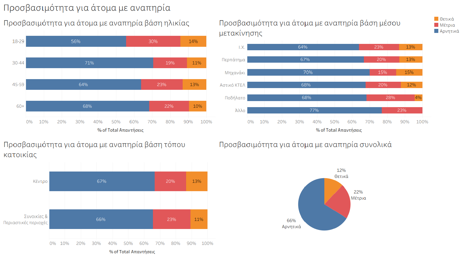 Συνολικά, τα αποτελέσματα δείχνουν ότι η προσβασιμότητα για τα άτομα με αναπηρία χρειάζεται σημαντικές βελτιώσεις, καθώς η πλειονότητα των πολιτών την αξιολογεί αρνητικά ή μέτρια, με μικρό ποσοστό να τη θεωρεί ικανοποιητική.