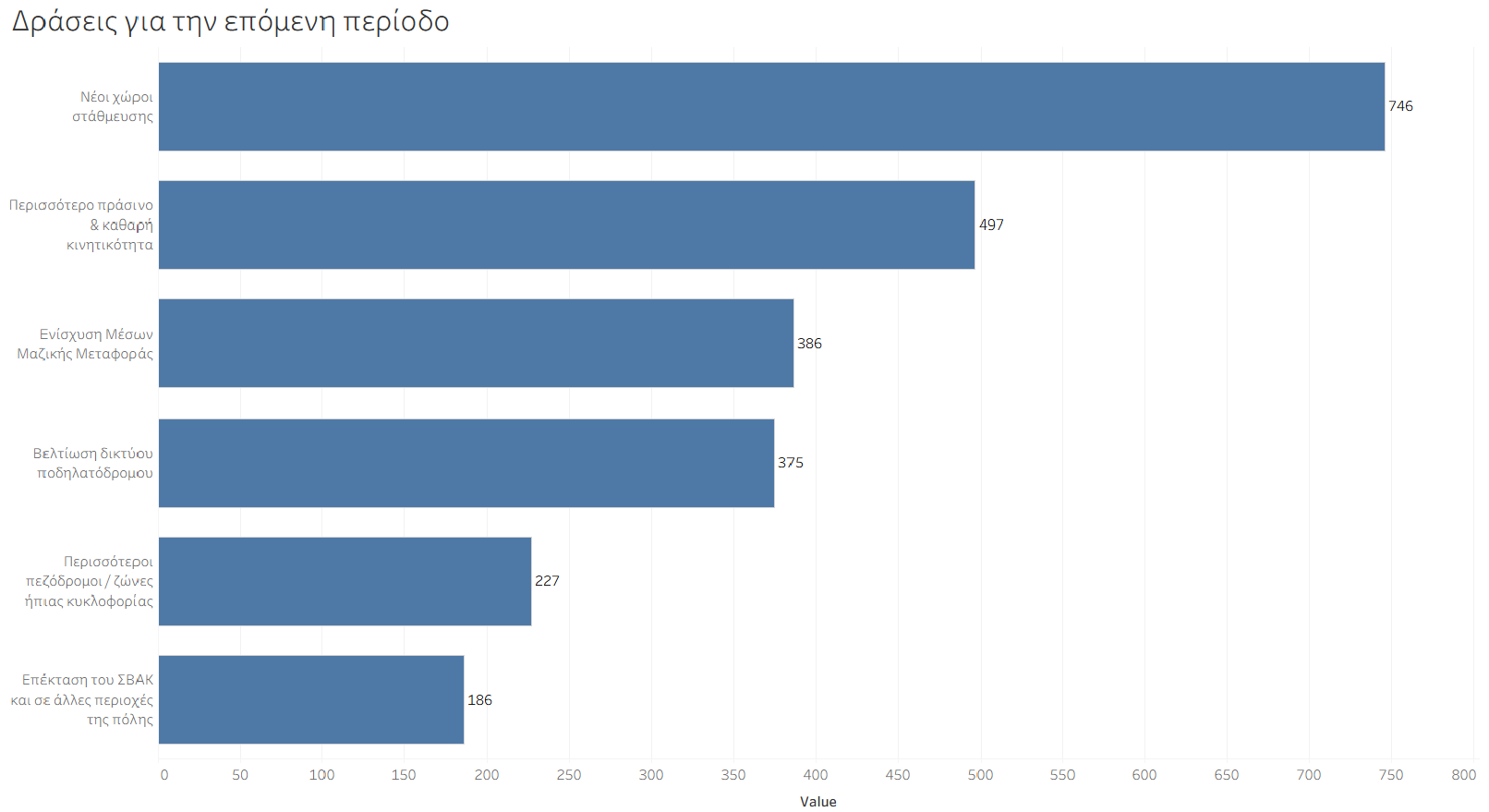 Επιπλέον, στην έρευνα καταγράφονται και συγκεκριμένες προτάσεις των πολιτών, όπως η δημιουργία περισσότερων χώρων στάθμευσης, η ενίσχυση των μέσων μαζικής μεταφοράς, η ανάπτυξη συνεχόμενων και ασφαλών ποδηλατοδρόμων, καθώς και η βελτίωση της προσβασιμότητας για όλους.