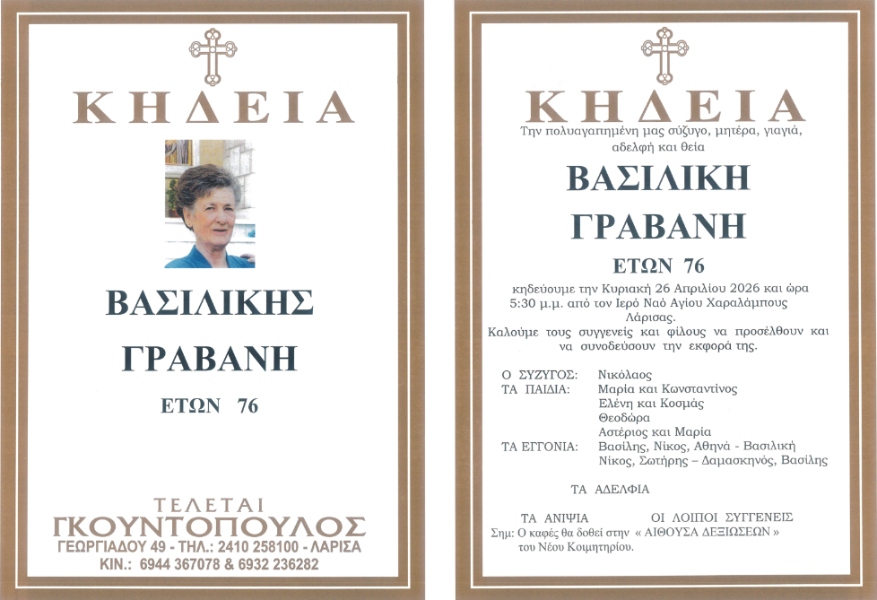 Η εξόδιος ακολουθία θα τελεστεί αύριο στις 17:30 στον Ι.Ν. Αγίου Χαραλάμπους Λάρισας