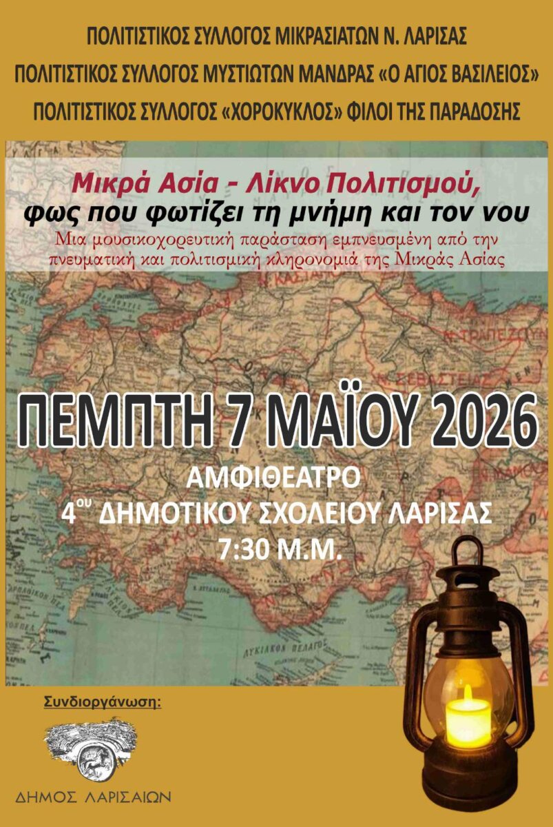 Ο Πολιτιστικός Σύλλογος Μικρασιατών Ν. Λάρισας, ο Πολιτιστικός Σύλλογος Μυστιωτών Μάνδρας «Ο Άγιος Βασίλειος» και ο Χορόκυκλος «Φίλοι της Παράδοσης» διοργανώνουν σε συνεργασία με τον Δήμο Λαρισαίων μια παραδοσιακή μουσικοχορευτική παράσταση εμπνευσμένη από την πνευματική και πολιτισμική κληρονομιά της Μικράς Ασίας.