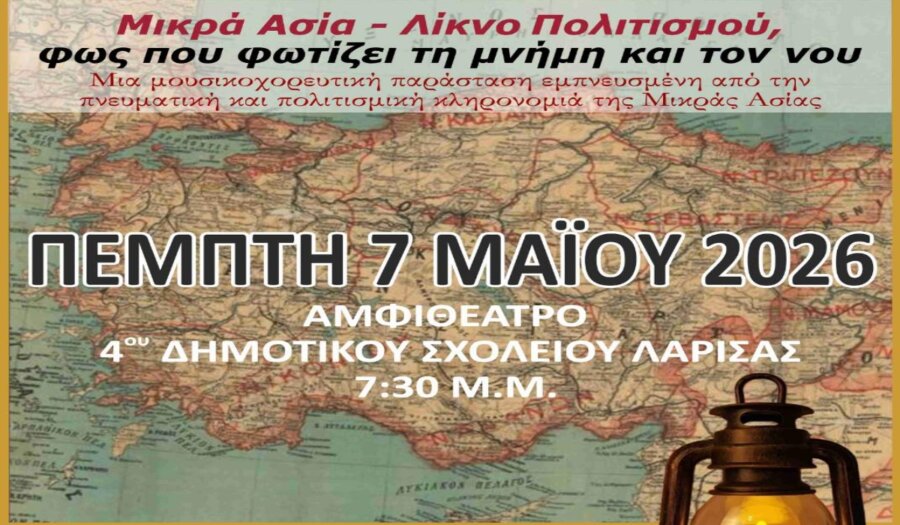 Η εκδήλωση θα πραγματοποιηθεί την Πέμπτη 7 Μαΐου 2026 και ώρα 19:30 στο αμφιθέατρο του 4ου Δημοτικού Σχολείου Λάρισας.