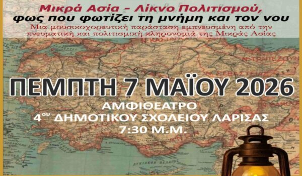 Η εκδήλωση θα πραγματοποιηθεί την Πέμπτη 30 Απριλίου 2026 και ώρα 19:00, στο αμφιθέατρο της Δημοτικής Πινακοθήκης Λάρισας.