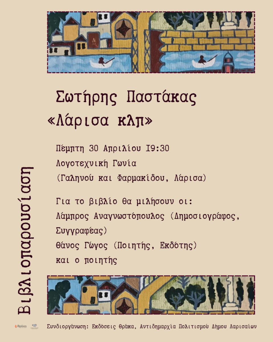 Η 20η ποιητική συλλογή του Λαρισαίου ποιητή και γιατρού Σωτήρη Παστάκα, «Λάρισα κλπ», παρουσιάζεται την Πέμπτη 30 Απριλίου 2026 στις 19:30 στη Λογοτεχνική Γωνία (Γαληνού και Φαρμακίδου), στη Λάρισα, από τις Εκδόσεις Θράκα και την Αντιδημαρχία Πολιτισμού του Δήμου Λαρισαίων.
