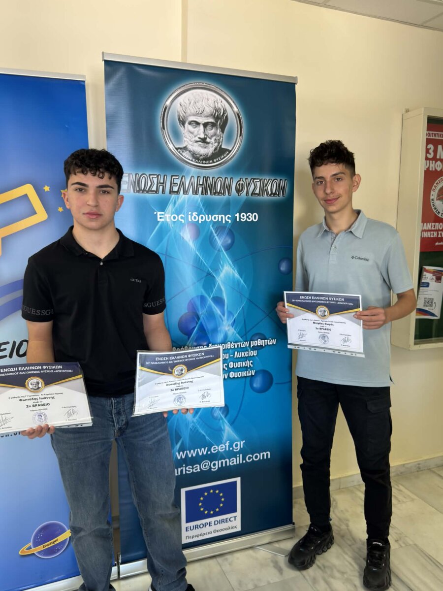 Μεταξύ των διακριθέντων και οι μαθητές του Προτύπου Γενικού Λυκείου Λάρισας Πάρης Νικολάου της Β΄ τάξεως που συγκαταλέχθηκε στους 25 μαθητές σε πανελλαδικό επίπεδο που κέρδισαν 1ο Βραβείο στο «Δημόκριτο» και οι Θωμάς Μπίρδας και Γιάννης Φωτιάδης της Α΄ τάξεως Λυκείου που κέρδισαν 3ο Βραβείο στον «Δημόκριτο», ενώ ο Γιάννης Φωτιάδης πήρε και το 2ο Βραβείο στον «Αρίσταρχο».