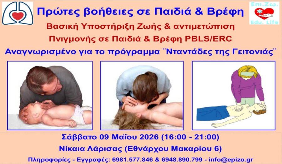 Το Σάββατο 09 Μαΐου 2026 το απόγευμα (16:00 – 21:00), θα υλοποιηθεί το πιστοποιημένο σεμινάριο ¨Βασική Υποστήριξη Ζωής & αντιμετώπιση πνιγμονής σε Παιδιά & Βρέφη – PBLS, ERC¨, στη Νίκαια Λάρισας (Εθνάρχου Μακαρίου 6).